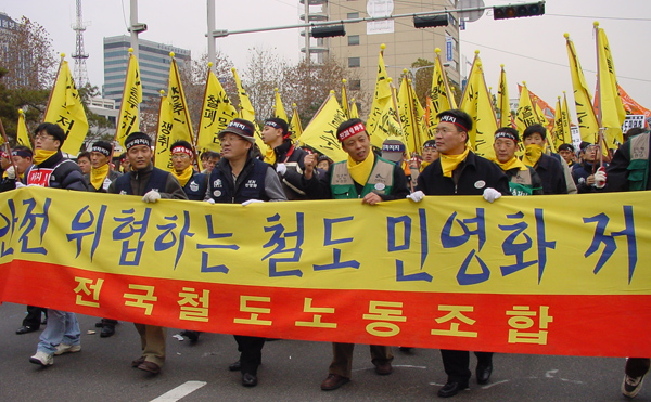 1997년 IMF 위기 후 출범한 김대중 정부는 신자유주의 구조조정 정책을 강하게 펼쳐나갔다. 정부가 사용자인 공공부문에서 구조 개악이 실행되어 포항제철, 한국통신, 담배인삼공사 등 주요 공기업이 민영화되었으며 교통, 가스, 전력 등의 민영화가 연이어 추진되었다. 2001년 1월 20일 김대중 대통령은 건설교통부 업무보고 회의에서 철도청 운영 적자를 명분으로 “어느 나라에도 철도가 국영화된 나라는 없다”며 철도구조개혁법을 마련해 연내 반드시 철도 민영화를 이루라고 지시한다. 그해 2월 건교부는 철도산업구조개혁기본법안을 입법 예고했고 8월에는 건설교통부, 기획예산처, 행정자치부의 의견을 종합하여 최종 기본법안을 발표하였다. 12월 4일에는 정례국무회의를 열어 철도 민영화 관련 법안을 의결해 국회에 제출했다. 법안은 ‘철도산업발전 및 구조개혁에 관한 법률안’과 ‘한국철도시설공단법안’으로 기존의 철도청과 고속철도공단을 해체 통합, 철도시설의 건설과 자산관리는 2003년 7월 발족하는 철도시설공단이 맡고, 운영은 2003년 7월 전액 정부출자로 철도운영회사를 만들어 넘긴 뒤 단계적으로 주식매각을 통해 완전 민영화한다는 내용을 담았다.