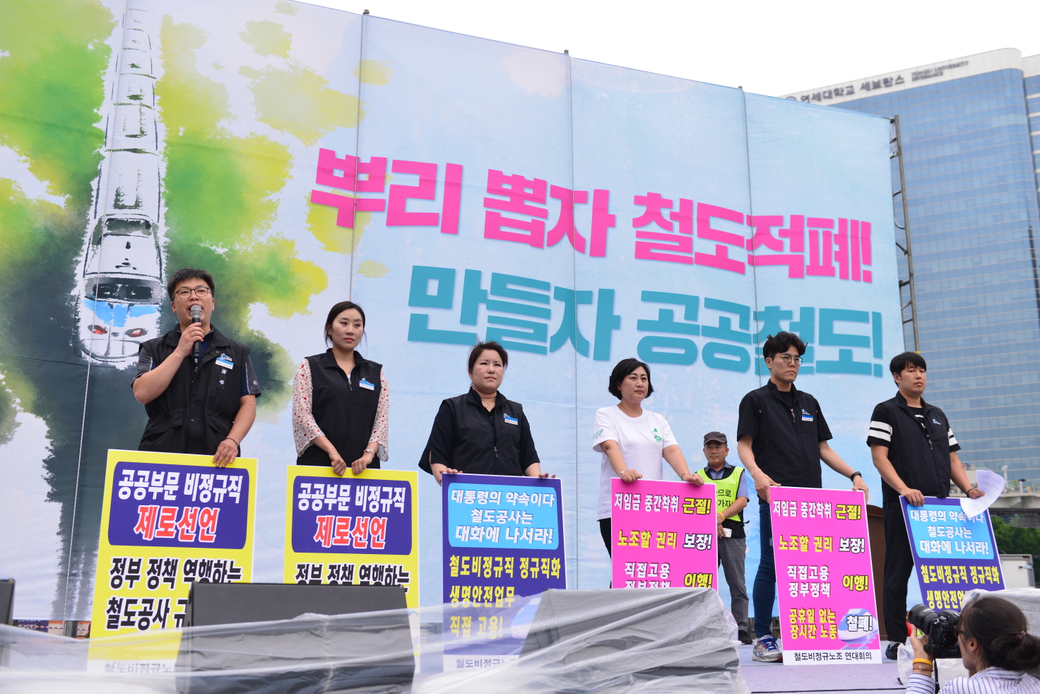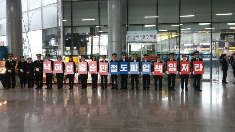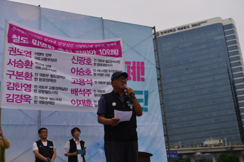 시민사회공동행동이 오전 11시 대전 코레일 본사 앞에서 기자회견을 열고 시민 안전 위협하는 부당징계 철회와 성과퇴출제, 외주화 중단을 요구함. 기자회견 참가자들은 “홍순만 사장은 박근혜 적폐”라고 규정함.
